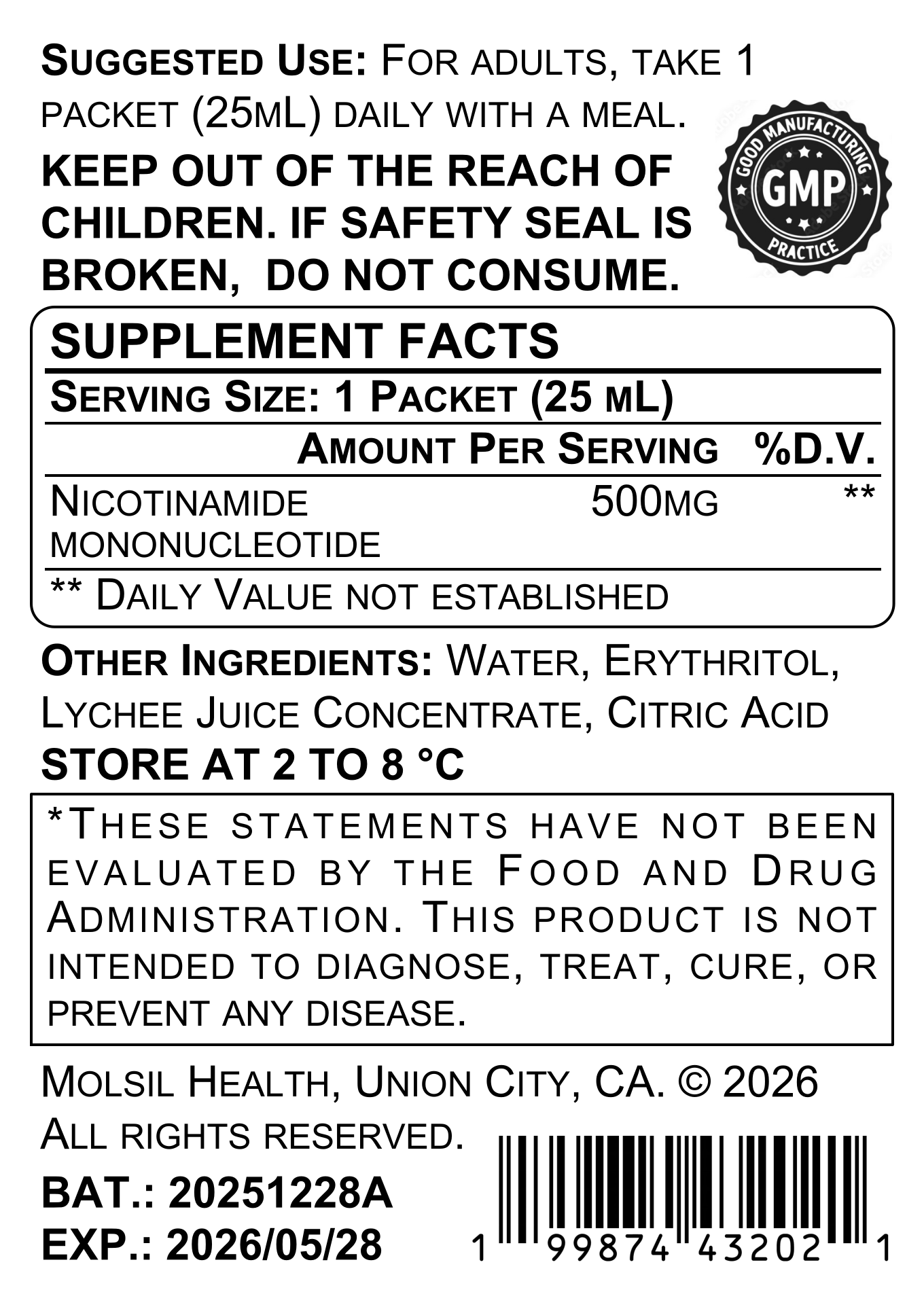 Ready-to-drink packets containing 500 mg NMN helps support healthy aging. Convenient, great-tasting lychee-flavored drinks make it easier than ever to meet your health needs whether you are on-the-go or have a busy schedule.